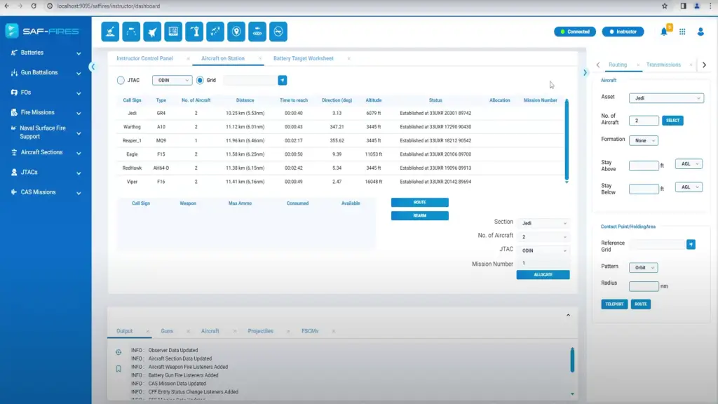 SAF-FIRES FST includes structured workflows developed with SMEs to ensure that there is a smooth and natural progression through the phases of allocating aircraft on station, check in procedures, game plans, nine line/ five line briefs, talk-on, instructions during an attack, and bomb hit assessments.